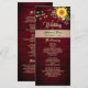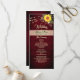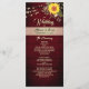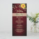 Menú de boda campestre, elegante, moderno, rústico de madera y burgundy con girasoles, encaje floral dorado y luces de cuerda. La elección perfecta para bodas de otoño.