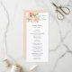 Aquí hay una hermosa tarjeta de programa de bodas que cuenta con hermosas acuarelas con flores de estilo impresionista y follaje, con colores en este diseño de línea estilo libre de rosa coral, melocotón mangerino, verde cálido amarillo y verde azul fresco. A la derecha de la imagen floral está su texto personalizado en verde. Debajo de la imagen hay campos de texto adicionales en gris suave. La parte posterior de la tarjeta es melocotón de mandarina sólida.