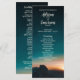 Elegante y moderna tarjeta de plantilla de programa de boda. El fondo es una hermosa fotografía de un oscuro cielo azul turquesa nocturno con una galaxia de estrellas por encima y un amanecer sobre las montañas por debajo. El texto es completamente personalizable y es un elegante par de guiones y sans serif. Si necesitas revisar las áreas de texto para adaptarte a tus necesidades, envíanos un mensaje a mí y a mí con mucho gusto.