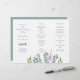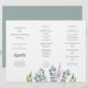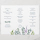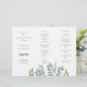 Plantilla de programa de boda doblado con eucalipto. Doblar como un acordeón para usar en la ceremonia. Un pequeño ramo de hojas gris-azuladas decora la parte delantera (panel lateral izquierdo) justo debajo de los nombres de la pareja. Más vegetación y un ramito de lavanda "crecen" desde la parte inferior del papel blanco. El reverso es de color gris-azul sólido.