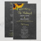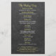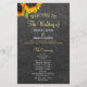 Plantilla de programa de boda rústica y elegante para ceremonia y fiesta, con presupuesto asequible, que incluye dos hermosos girasoles amarillos y naranjas, y una elegante caligrafía falsa en oro y blanco sobre un fondo oscuro de pizarra de tiza gris. ++++++++++++ ¡Personalízalo con tus detalles! +++++++++ Adecuado para bodas de jardín rústico en verano o otoño en el jardín trasero al aire libre.