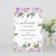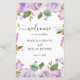 Programa de bodas moradas florales con un borde de flores acuáticas pintadas en tonos violeta pastel, lavanda, lila y marfil. Dentro está el mensaje "Bienvenido a nuestro boda" en un guión elegante junto con sus nombres y fecha. La parte trasera tiene tu orden de ceremonia, fiesta de boda y mensaje de agradecimiento. Estos programas de boda baratos se imprimen en hojas de papel para una opción asequible y son perfectos para un boda de primavera o verano.