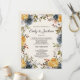Elegante y rústico programa de bodas floridas color mostaza amarillo y azul marino pintado a mano con el horario de la ceremonia junto con la lista de la fiesta nupcial.