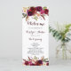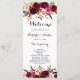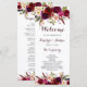 Tarjeta de programa de boda de estilo bohemio con ilustración de acuarela de peonías y rosas rojas y borgoña con acento de plumas. Esto es perfecto para la invitación de boda de otoño y invierno. Los artículos coincidentes también están disponibles.