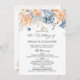 Este diseño presenta una ilustración de acuarela de flores de melocotón pálido y rubor azul con confeti de efecto dorado en la parte superior de la tarjeta.