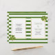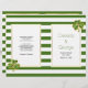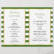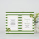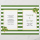 Programa de ceremonia y fiesta de boda del Día de San Patricio con trébol irlandés y rayas blancas y verdes. Los elementos de esta plantilla de programa de boda son el patrón de rayas verdes y blancas y el trébol en las esquinas de un marco blanco con su texto. Elija solo el papel de valor para este programa, ya que se dobla bien y dóblelo por la mitad manualmente.