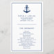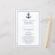 Programa de boda náutico que presenta un ancla azul marino con su monograma a ambos lados, sobre un fondo blanco. La parte delantera tiene los eventos de su ceremonia y la parte trasera tiene su cortejo nupcial. Un diseño simple pero elegante que es perfecto para una celebración con tema de playa en verano. Estos programas de boda económicos se imprimen en hojas de papel para una opción económica.