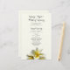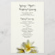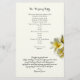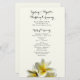 Programa de boda plano con flores de plumería amarillas. Papel amarillo pálido con plantillas de texto en ambos lados para una ceremonia boda tradicional. En la parte delantera, incluye un título, fecha, nombre del lugar y orden de la ceremonia. Al dorso, enumera la fiesta de bodas, el funcionario, los padres y abuelos, e incluye un párrafo de agradecimiento. También se puede mencionar a los seres queridos que han fallecido. Este artículo viene con mejoras.