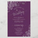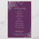 Estos programas de bodas son elegantes y de buen gusto, pero siguen siendo asequibles. El diseño presenta unos ondulados rizos de Relieve metalizado gris plateado y remolinos con texto gris claro sobre un fondo de color ciruela morado. La tipografía incluye caligrafía de escritura de encaje, y hay espacio para detalles de la ceremonia, la fiesta de las novias y un breve agradecimiento.
