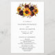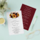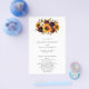 Floral girasol barato programa de bodas con un ramo rústico con girasoles pintados con acuarela, rosas rojas, flores moradas y vegetación. Este elegante programa es ideal para una boda de otoño con temática boho. Estos programas de boda baratos se imprimen en hojas de papel para una opción asequible.