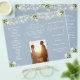 Este elegante programa de boda trifold presenta vegetación floral y luces de cuerda sobre un fondo azul polvoriento. Diseñado por Thisisnotme©