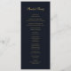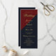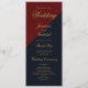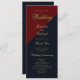 Un moderno programa de bodas burdeos y azul marino con texto dorado.