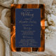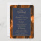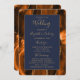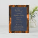 Este elegante y moderno programa de bodas cuenta con un naranja quemado con un fondo adornado con un falso purpurina de oro. El texto aparece en letra elegante de color dorado y fuentes de copperplate en un rectángulo azul marino oscuro.