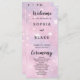 Presentamos nuestro programa de Bodas Nocturnas Míticas, un atractivo y encantador complemento a su día de bodas. Este exquisito diseño luce un cielo nocturno rosa y violeta, decorado con delicadas estrellas rosas y blancas, creando un ambiente místico y celestial que desprende romanticismo y encanto. En la portada, el texto está cuidadosamente presentado en negro clásico, con los nombres de la pareja, la fecha boda y la ubicación con elegancia subestimada. La minuciosamente curada orden de la ceremonia es minuciosamente detallada, lo que garantiza que sus invitados puedan seguir cada momento de su día especial sin problemas. Añadiendo un toque de encanto al programa, las palabras "Bienvenida", "Ceremonia" y "Fiesta de la Boda" están redactadas delicadamente en una fuente decorativa de escritura. Estos detalles ornamentales infunden el programa con un sentido de magia y celebración, bellamente contrastando con la simplicidad del tipo de letra de bloque. Esta armoniosa mezcla de estilos refleja la esencia de la modernidad y el encanto atemporal. En la portada trasera, se celebra a los estimados miembros de la fiesta de bodas, destacando sus roles de una manera que complementa el tema celestial. Cada detalle está diseñado meticulosamente, creando un programa de bodas cohesivo y visualmente atractivo que refleja tu estilo único y tu historia de amor. Celebra tu historia de amor con nuestro programa de Bodas Nocturnas Míticas, una elección sofisticada que promete mejorar la belleza de tu ceremonia. Dejemos que el diseño encantador y la meticulosa atención a los detalles hagan de su celebración boda una experiencia inolvidable, dejando a todos cautivados por la elegancia celeste y el romance de su unión.