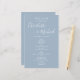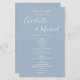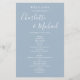 Elegante programa de bienvenida de boda de script de firma azul polvoriento con nombres de estilo de firma. Personalice los detalles del día de la boda con letras blancas de moda. Diseñado por Thisisnotme©