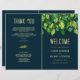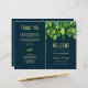 Diseño creativo boda con abundante follaje de mano dibujado a mano de manera moderna imitando la textura metálica. Tonos verdes, dorados, cobre, platino, turquesa, azul oscuro. Fondo azul profundo. Grabado dorado (el oro no es oro real, sino color). Fuentes modernas y simplificadas. Verdaderamente único, involucrado y elegante. Para bodas en otoño, bodas de verano, bodas en el jardín o cualquier tipo de boda moderna y elegante.