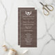 Vintage moda de campo de grano de madera marrón oscuro modelo de programa de bodas. Grungy diseño de antler de ciervos con romántico corazón rústico y tipografía de escritura elegante. Fondo del panel de madera del granero con texto blanco. Personalizar qué debe estar en su programa. Papel de moda para matrimonios para novios y novios elegantes. Incluya nombres, fecha, lugar, orden de la ceremonia y fiesta de boda. Parte de la hermosa colección de temas de caza a juego con accesorios de novia y otros suministros chic y desgastados.