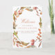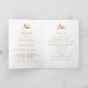 Un elegante programa de bodas en otoño con tipografía de guion y una corona acuática compuesta de hojas de terracota, marrón y verde. Personaliza todo el texto para tus necesidades.