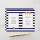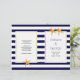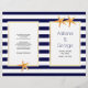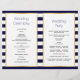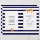 Ceremonia de boda plegada y programa de fiestas en la playa de rayas blancas azul marino y estelar. Los elementos de esta plantilla de programa de boda son el patrón de rayas azul marino y blanco y la estrella de mar sobre un marco blanco con tu texto. Elija sólo el papel de valor de este programa a medida que se dobla bien y lo dobla a la mitad manualmente.