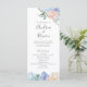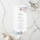 Programas nupciales de doble cara con un romántico diseño floral azul y rosa polvoriento. En la parte delantera se muestra el texto del orden de la ceremonia, y los detalles de la fiesta de boda y una nota de agradecimiento a los invitados están en la parte trasera.