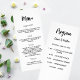 Programa de recepción de bodas y menú. Personalice y agregue su nombre, su programa y el menú. Fondo blanco, texto negro. Volver: añadir el menú de la cena de la celebración.