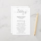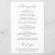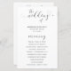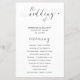 Programa de bodas de tipografía en blanco y negro con las palabras "el boda de" con golpes, un corazón al final y salpicando la "i". Debajo están sus nombres, ciudad, estado y fecha. La parte delantera tiene tu orden de ceremonia y la parte trasera tiene tu fiesta de boda y mensaje de agradecimiento. Estos programas de boda baratos se imprimen en hojas de papel para una opción asequible.