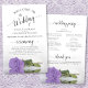 Estos programas de bodas son elegantes y de buen gusto, pero siguen siendo asequibles. El diseño se compone de un único rosa de color púrpura claro de tallo largo o lavanda que se encuentra en su lado, reflejando en un estanque de agua con olas y ondas. La tipografía incluye caligrafía de escritura negra y encaje, y hay espacio para detalles de la ceremonia, la fiesta de las novias y un breve agradecimiento.