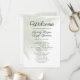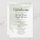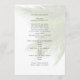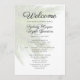 Plantilla de programa de boda en playa tropical plana con palmas. Blanco con texto personalizado negro en ambos lados, este diseño de programa tiene hojas de palma verde claro como fondo.