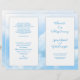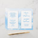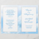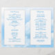 Plantilla de programa de bodas católicas plegadas con fondo de cielo azul, impresa en el papel de su elección. Este programa de aspecto estratificado contiene cuatro "páginas" para el personalizar. Los paneles de color blanco sólido contienen el texto azul que tiene un aspecto moderno de escritura manuscrita combinada y fuentes impresas. Cada página tiene espacio para un montón de texto para acomodar una ceremonia involucrada. La última página (parte posterior del programa cuando se dobla) incluye una sección para las escrituras (muestra: "El amor es paciente, el amor es amable" de 1 corintios) y un mensaje de la novia y el novio. Los programas tienen opciones de papel y deben plegarse después de la compra.