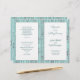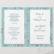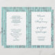 Plantilla de programa de bodas católicas plegadas con fondo rústico de madera azul, impresa en el papel de su elección. Este programa de aspecto estratificado contiene cuatro páginas para el personalizar. Los paneles de color blanco sólido contienen el texto azul verde azulado que tiene un aspecto moderno de escritura manuscrita combinada y fuentes impresas. Cada página tiene espacio para un montón de texto para acomodar la ceremonia religiosa. La última página (parte posterior del programa cuando se dobla) incluye una sección para las escrituras (muestra: "El amor es paciente, el amor es amable" de 1 corintios) y un mensaje de la novia y el novio. Cada hoja de papel tiene texto en ambos lados para crear un programa, que se doblará después de la compra.