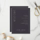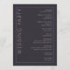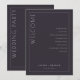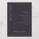 Este elegante programa de boda presenta un diseño minimalista con un fondo gris oscuro y tipografía moderna y limpia. El diseño está orientado verticalmente, dividido por una delgada línea blanca, creando dos secciones: una para el acogedor "BIENVENIDOS" en fuente serif grande y otra que enumera los eventos de la ceremonia en un estilo sans-serif centrado. Los marcadores de posición personalizables permiten la personalización con nombres y fechas, lo que lo hace perfecto para celebraciones formales. El ambiente general es sofisticado y anticipatorio, ideal para un evento memorable.