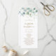 Este programa de bodas presenta eucalipto de acuarela pintada, hojas botánicas verdes y purpurinas doradas con escritura dorada.