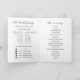 Nuestro Programa de Timeline de Ceremonia de Boda con Foto Elegante es un diseño hermoso, creado para guiar a sus invitados a través de su día de boda mientras captura el corazón de su historia de amor. Curado con esmero y refinado visualmente, este programa es más que un itinerario, es un recuerdo preciado que sus invitados atesorarán durante años. Con espacio para una foto de compromiso o boda favorita, el programa describe con elegancia el cronograma de la ceremonia, presenta al séquito nupcial e incluye una sección conmovedora de "En memoria amorosa" para honrar a aquellos que están presentes en espíritu. Un área dedicada invita a los invitados a su recepción, con detalles de hora y dirección, mientras que un cálido mensaje de agradecimiento expresa su gratitud por compartir su día especial. Perfecto para parejas que valoran el diseño atemporal, los detalles significativos y las primeras impresiones inolvidables.