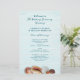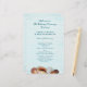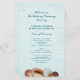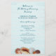 Programa de bodas en mares vivos impreso en papel asequible. Texto personalizar en ambos lados sobre una imagen de madera azul claro. En el frente, el fondo tiene conchas realistas y un dólar de arena. El texto es de color azul marino y alterna entre el guión y los tipos de letra impresos. En la parte de atrás se da espacio para un breve mensaje de la pareja. El papel tiene un tamaño de 5,5 x 8,5.