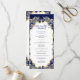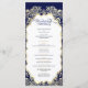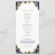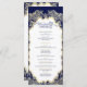 Esta tarjeta de programa de bodas presenta un diseño minimalista en azul marino y oro clásico. El frente resalta los nombres de la pareja dentro de un marco dorado con fondo marino, dando un toque formal y sofisticado. La página de atrás presenta los detalles completos del boda en un diseño limpio y moderno, acentuado por sutiles resaltados dorados. El emparejamiento atemporal del azul marino y el oro brillante crea un diseño elegante y distinguido, perfecto para ceremonias formales y papelería de sake.