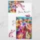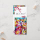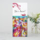 Invitación de arte fino colorida, elegante y vibrante. Bailarines de carnaval romántico: figuras de baile artísticas, caprichosas y expresivas, una hermosa mujer rubia con trajes emplumados y brillantes baila con un joven arlequín con adornos de borgoña roja en la parte posterior de la tarjeta. Pintura en acuarela en colores rosa brillante, fucsia, verde, rojo, azul y amarillo, destellos de oro inspirados en la Comedia del Arte (Commedia dell'arte) y el Carnaval de Venecia. También es un diseño hermoso para anuncios de boda, programas, "save the date", aniversario, reuniones, compromisos románticos, ducha de novia, ocasiones especiales, fiesta de vacaciones, baile de máscaras de Mardi Gras, fiestas de cumpleaños. Dulces 16, bailes de disfraces de Quinceañera