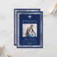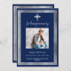 Un elegante, moderno, simple funeral/celebración de un programa de vida. Un fondo azul marino decorado con una falsa cruz de plata y marcos falsos de plata. Personalice y agregue un nombre de foto y detalles. Texto blanco.