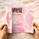 Celebre la vida de una madre querida con esta plantilla de programa de funeral de alas de ángel rosa suave. Honre la memoria de su ser querido con esta elegante Plantilla de Programa de Funeral de Alas de Ángel Rosa, diseñada en tonos suaves de rosa y nubes celestiales. La delicada ilustración de alas de ángel y la paleta de colores suaves crean un tributo pacífico y reconfortante para los servicios de memorial y celebración de la vida.