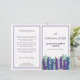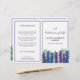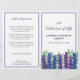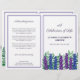 Programa funerario floral en blanco con fuentes moradas oscuras, vegetación y flores azules y moradas. En la parte posterior puede escribir el obituario y el programa. Pórtalo tú mismo para un programa práctico.