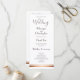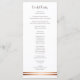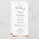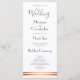 Un elegante y moderno programa de bodas blancas con dos bandas de oro de cobre y rosa en la parte inferior de la tarjeta. La ceremonia y el agradecimiento de los bodas se han incluido en la parte delantera del programa, mientras que toda la fiesta nupcial se ha incluido en la parte de atrás.