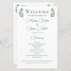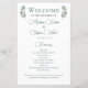 Un simple y elegante programa de bodas verdes con dos hojas de eucalipto de acuarela a ambos lados de la parte superior alrededor del título. Un hermoso y minimalista programa de bodas con los detalles de tu ceremonia en la parte delantera y los miembros de la fiesta nupcial en la parte trasera. Moda, papel boda moderno para un evento en el jardín.