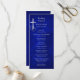 Esta elegante tarjeta de programa de bodas cuenta con dos corazones de plata al pie de una impresionante cruz de plata en la esquina superior izquierda. Las imágenes de cruz y corazón brillan sobre un fondo azul abstracto. Hay mucho espacio para tu texto personalizado, también en plata. Si necesita cambiar el tipo de letra, el tamaño, la ubicación o el color del texto, utilice el Personalizar It. La parte posterior de la invitación tiene el mismo fondo azul sin el texto o las imágenes.