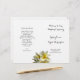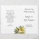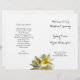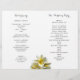 Programa de boda doblado con diseño de flores de plumería amarilla. Color de color crudo con plantillas de texto en negro en cuatro páginas - cuando se pliega. El texto se imprime a ambos lados de este papel de 8,5 x 11 pulgadas, con actualizaciones opcionales, para crear un programa plegado por hoja. La portada tiene el título, los nombres completos de la pareja y un lugar para la fecha, hora y lugar de celebración. Incluya un párrafo para agradecer a la familia y amigos que aparecerá en el reverso del programa. Voltea el papel y crea dos columnas de texto para "la ceremonia" o "orden de la ceremonia", y lista "la fiesta de la boda".