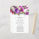 Programa de Bodas Florales con peonías en violeta y violeta violeta vibrante, fuschia y violeta junto con el título y la cabecera de la parte trasera en un guión caprichoso con chispas. Estos elegantes programas de bodas en tonos violeta y elegantes son perfectos para un boda de verano y se imprimen en hojas de papel para una opción económica.