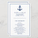 Programa de bodas náuticas con ancla azul marino con tu monograma a cada lado, sobre un fondo blanco. La parte delantera tiene tus eventos de ceremonia y la parte trasera tiene tu fiesta de boda. Un diseño sencillo pero elegante, perfecto para una celebración temática de playa en verano. Estos programas de boda baratos se imprimen en hojas de papel para una opción asequible.