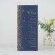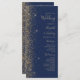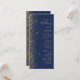 El borde izquierdo de este elegante y moderno programa de bodas presenta un diseño purpurina de imitación dorada. El texto del personalizable combina la escritura a mano de color dorado pálido, el copperplate y las tipografías cursivas en un fondo azul marino.