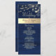 Este rústico programa de bodas azul marino cuenta con brillantes luces de cuerda y delicadas obras de arte florales en oro, perfectas para un boda de invierno o de granero. Con espacio para los detalles de la ceremonia, nombres de fiestas de novias y una nota personal de agradecimiento, este elegante diseño aporta calidez y encanto a su día especial.