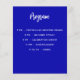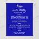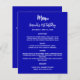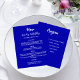 Un fondo azul real. Texto blanco. Front: Personalice y agregue su nombre, fecha y menú. Volver: Programa. Si tiene un programa grande puede reducir el espaciado de línea. 1 hoja = 1 borde impreso del menú a borde.