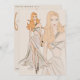 Una modelo de moda rubia de fresa pintada a mano usando un traje de beige en un elegante programa de beneficencia de moda invitación en crema neutra