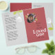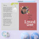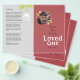 Un nuevo y limpio programa de servicios funerarios o funerarios con estilizados gráficos de rosa amarilla y tipografía de Loved One con "pre-more" en un símbolo infinito. NOTA Estos vienen como una hoja plana. Tendrás que doblarlas tú mismo.